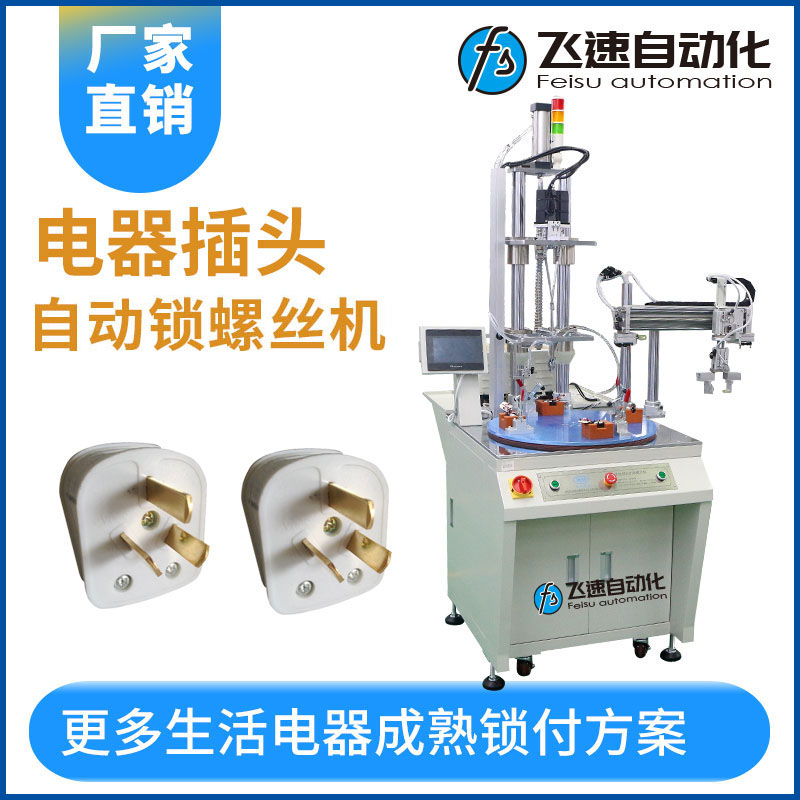 電源插頭作為一種日常用品,在生活中被廣泛使用。因此它的使用安全性也越來(lái)越引起人們的重視。現(xiàn)在常用的電源插頭由于為了便于插腳能順利的插入到插座的插孔中,一般是插座的插孔的內(nèi)徑大于插腳的外徑并且插孔的絕緣上蓋上設(shè)置有倒角。但是這種結(jié)構(gòu)也帶來(lái)了安全隱患。因?yàn)樵诓蹇椎慕^緣上蓋處,插腳與插孔的內(nèi)壁之間存在著一定的縫隙,在插頭的插拔過(guò)程中,很容易從縫隙中帶入雜質(zhì),引起短路,更危險(xiǎn)的是,小孩有可能將手指伸入到縫隙中,有著觸電的危險(xiǎn),在生產(chǎn)中需要螺絲來(lái)緊固內(nèi)部的螺絲,傳統(tǒng)手工放置螺絲和對(duì)準(zhǔn)螺絲頭部仍需要占用大量的工作時(shí)間和精力,因此整體效率提升比較低,有而且很容易滑牙擰不緊等問(wèn)題造成產(chǎn)品質(zhì)量差,廠家會(huì)考慮到電動(dòng)螺絲刀或者氣動(dòng)螺絲刀擰緊兩種,后者通過(guò)電動(dòng)或者氣動(dòng)的方式產(chǎn)生旋轉(zhuǎn)動(dòng)力,以代替頻繁手工的擰緊動(dòng)作,雖然在生產(chǎn)上堅(jiān)強(qiáng)了勞動(dòng)的強(qiáng)度,但仍然存在生產(chǎn)效率得不到提升。 飛速自動(dòng)化提供一臺(tái)機(jī)械手轉(zhuǎn)盤(pán)式自動(dòng)擰螺絲機(jī)通過(guò)配置轉(zhuǎn)臺(tái)和機(jī)械手臂,由設(shè)備一次擰好多顆螺絲,擰好螺絲的產(chǎn)品由機(jī)械手臂抓起并放入流水線,設(shè)備可實(shí)現(xiàn)多軸擰螺絲、取放產(chǎn)品 、送螺 絲、員工放置工件等多工位同步圓周作業(yè),生產(chǎn)效率極高。 機(jī)械手轉(zhuǎn)盤(pán)式擰螺絲機(jī)詳細(xì)介紹 省人工,流水線專用,配置機(jī)械手和轉(zhuǎn)盤(pán),實(shí)現(xiàn)供料、檢測(cè)、鎖付、取放產(chǎn)品同步作業(yè),并由設(shè)備自動(dòng)完成,節(jié)省大量人工; 效率高,多把電批同時(shí)工作,可代替多名工人。電批數(shù)量可根據(jù)客戶要求定制; 易操作,傳統(tǒng)的手工取螺絲和對(duì)準(zhǔn)螺絲孔需要占用大量的工作時(shí)間和精力,只需不停放置工件; 智能化,PLC智能電路控制.配置觸摸屏,操作簡(jiǎn)單,員工只需放置工件即可; 高標(biāo)準(zhǔn),鎖付工序完全由設(shè)備按程序自行完成,避免人工誤操作帶來(lái)的不良影響; 性能穩(wěn),關(guān)鍵部位采用高品質(zhì)五金材料并經(jīng)過(guò)特殊處理,電子原器件采用原裝進(jìn)口。
