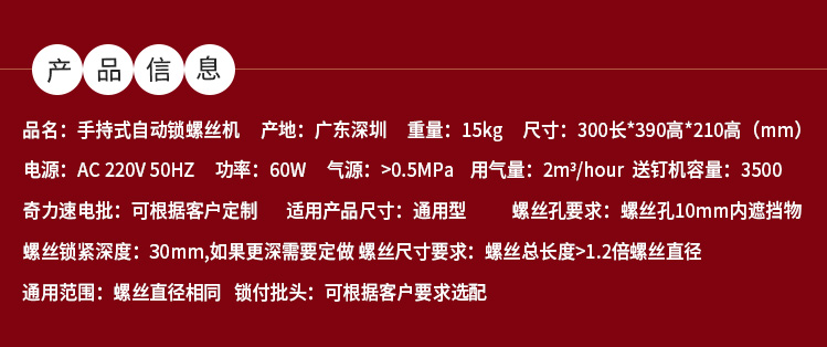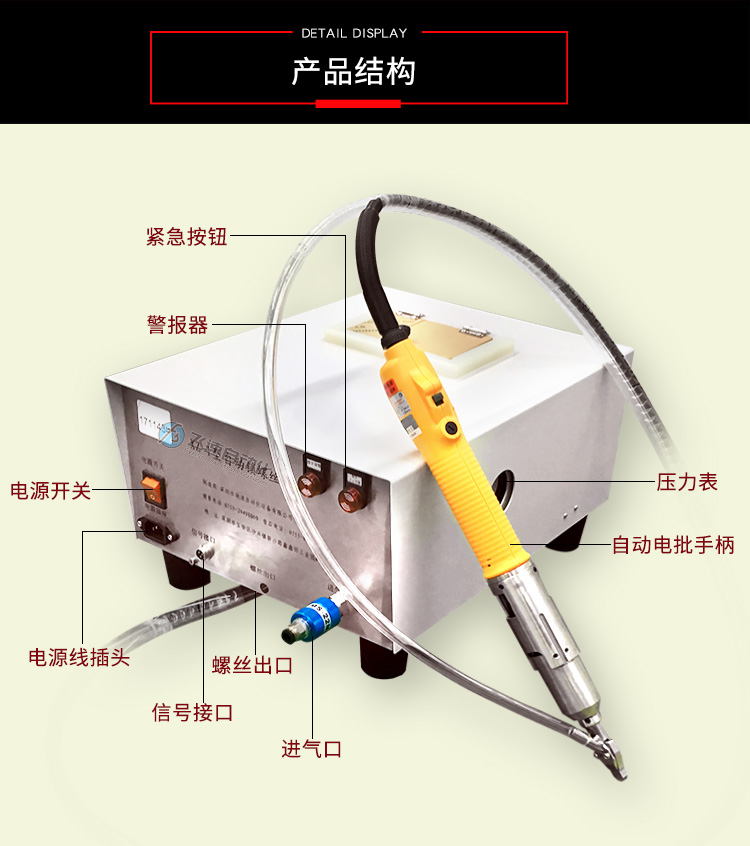 • 產品簡介: 手持式自動打螺絲機也叫自動供料鎖螺絲機、自動擰螺絲機等,嚴格來講,手持式只能算是半自動,因為它還是需要手工操作。一臺手持式自動鎖螺絲機主要由兩部分組成:自動供料機和電批,其中自動供料機是重要的,也是復雜的,它的好壞直接關系到機器卡不卡料的問題。1.采用渦輪上料,體積和噪音小、重量輕,可存放在工作平臺上,節省空間; 飛速手持式螺絲機: 1.螺絲自動排列、供料,自動篩選異型螺絲,自動補給空料,無料會自動報警; 2.送料采用感應器控制,鎖付完一顆來一顆,自動送料,不會出現重復給料現象; 3.滑牙不送料:在鎖付工程中,扭力達不到,螺絲不送出,防止批嘴出現卡料現象; 4.穩定性好,不卡料,即使不良導致卡料,非專業人員也可以在幾秒鐘內解決卡料; 5.效率高,一般1秒鐘打一個螺絲,不用抓起螺絲,只需對準螺絲孔位鎖緊螺絲即可; 6.可減少1到2個工人螺絲鎖付作業,實現半自動化生產,降低工人的勞動強度,提高生產率; 7.關鍵部位采用高品質五金材料并經過特殊處理,電子原器件采用原裝進口,確保設備零故障。 產品適用范圍 1.適用于各種類型的螺絲,螺絲總長應大于1.3倍螺帽直徑; 2.支持深孔螺絲鎖付,孔深小于40mm,M1-M6的螺絲; 3.適用于數碼、電子、小家電、電源開關、燈具、LED、玩具等產品。